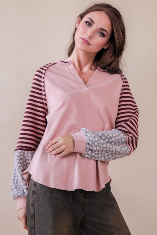 Effortlessly chic meets cozy comfort in this oversized knit top that's ready to become your new favorite. Featuring a charming mix of floral and stripe patterns, a relaxed split neckline, and long sleeves with trendy raw edges, it's the perfect piece for laid-back days. The rounded hem adds a soft, feminine touch that keeps things playful and fun. Layer it, dress it down, or wear it solo—this versatile top does it all with style.