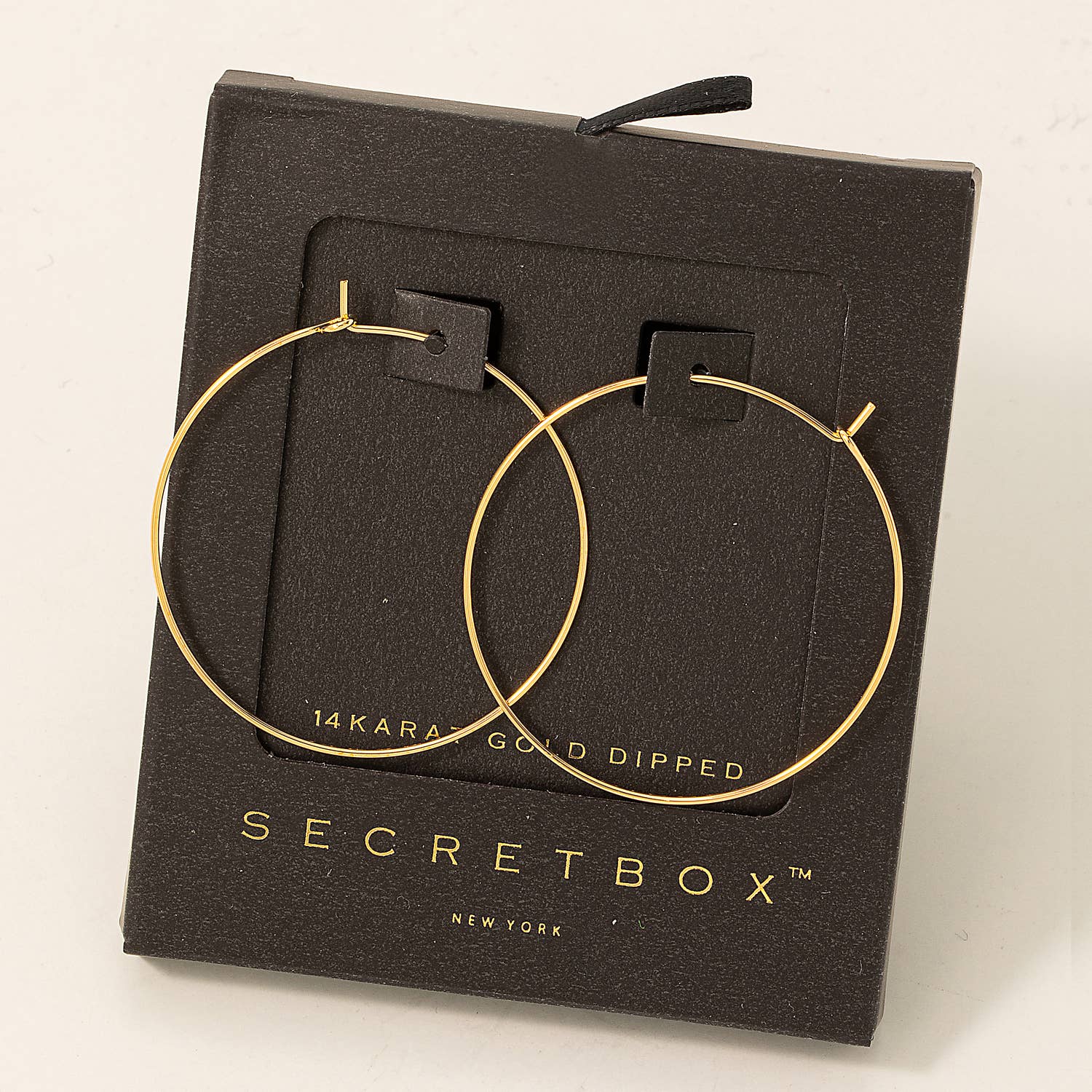 This pair of hoop earrings displays a vibrant secret box gold dipped thin hoop earrings style. Redefine your look effortlessly with this standout, on-trend piece.