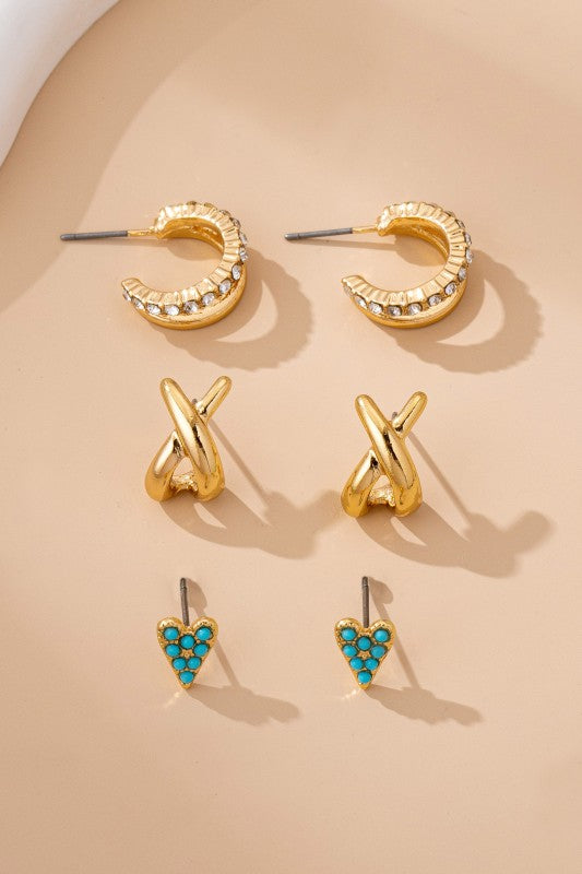 Get ready to turn heads with this stunning four-pair earring set that's basically a jewelry party on your ears! Featuring gold-tone beauties that range from boho-inspired turquoise arrowhead studs to modern crystal-studded half-hoops, you'll have the perfect pair for every mood and outfit. Rock the polished gold crisscross huggies for a sleek vibe, layer the textured crystal pave half-hoops for maximum sparkle, or go bold with the double-row crystal design. Mix, match, and make it yours—endless styling possibilities await!